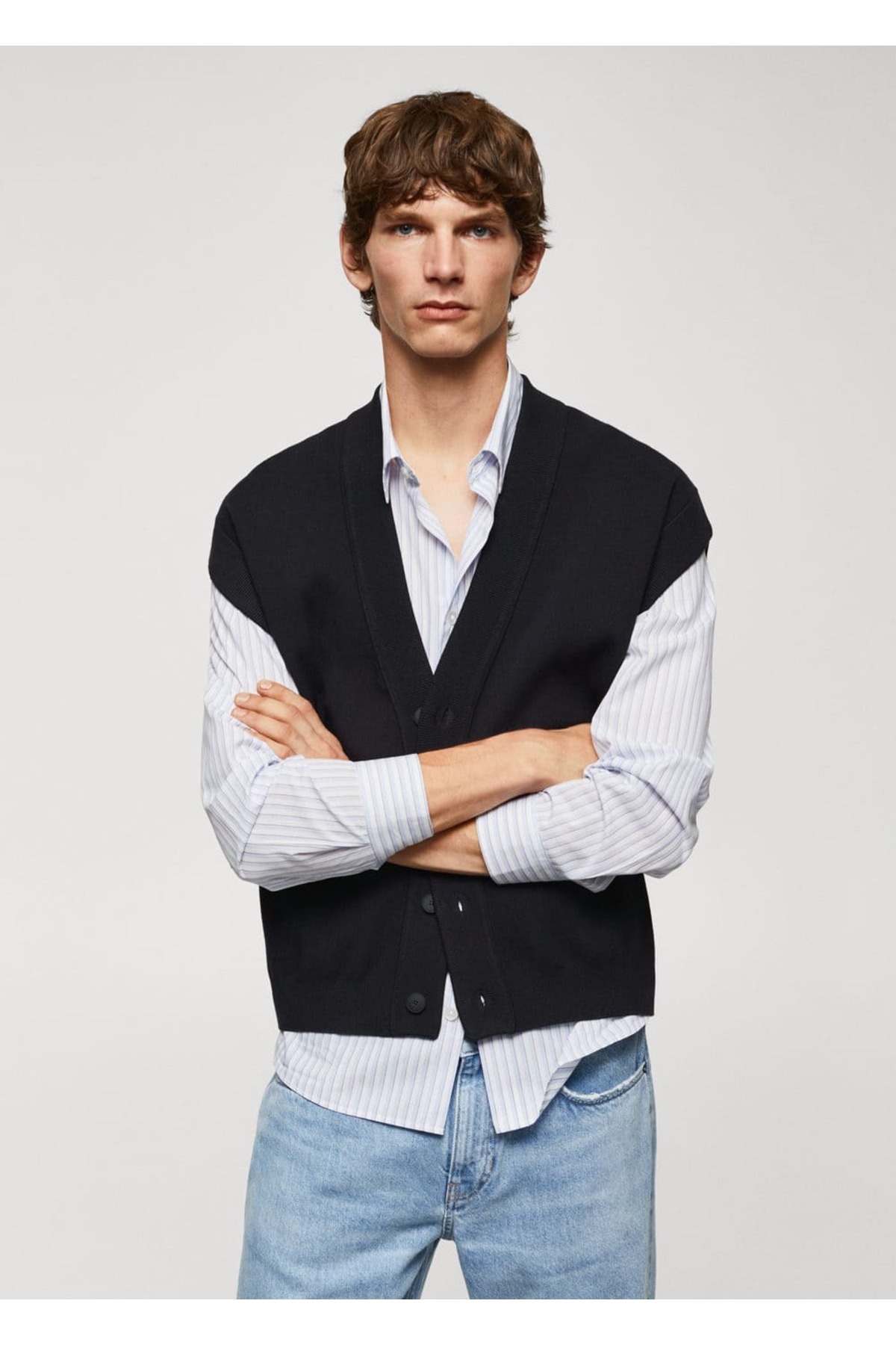 Kazak .– oslov. Geniş model, İnce örgülü kumaş, V yakalı, Ön düğmeli kapama, Kolsuz, Kenarları lastik örgü, Modelin boyu 190 cm’dir ve M beden giymektedir. 58% polyester,42% viskoz. Arka uzunluk 68.5 cm. ELDE MAKS. 30°C’DE YIKAYIN, ÇAMAŞIR SUYU KULLANMAYIN, MAKS. 110°C İLE ÜTÜLEYİN, KURU TEMİZLEME YAPILMAZ, KURUTMA MAKİNESİNDE KURUTULAMAZ