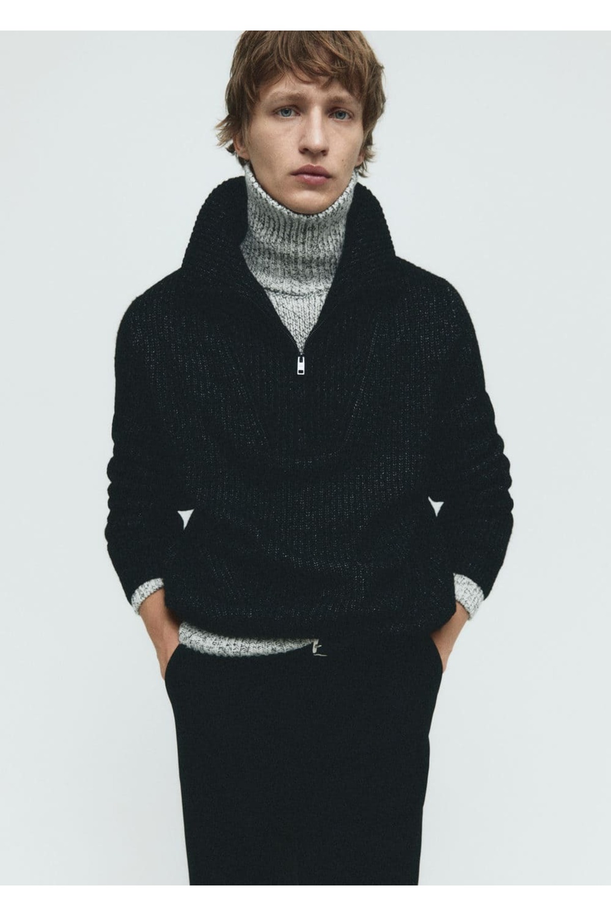 ژاکت .– دود. پارچه پشمی مخلوط، برش معمولی، پارچه بافتنی ضخیم، مدل پیچی، یقه پرکینز با زیپ بسته، آستین بلند، ساق صاف، مدل قد 190 سانتی متر و سایز M می پوشد. 36٪ پلی استر، 29٪ اکریلیک، 22٪ پلی آمید، 13٪ پشم. طول پشت 71.5 سانتی متر. حداکثر دست در دمای 30 درجه سانتی گراد بشویید، از سفید کننده استفاده نکنید، حداکثر. اتو را در دمای 110 درجه سانتیگراد، خشک شویی نکنید، در خشک کن نمی توان آن را خشک کرد.