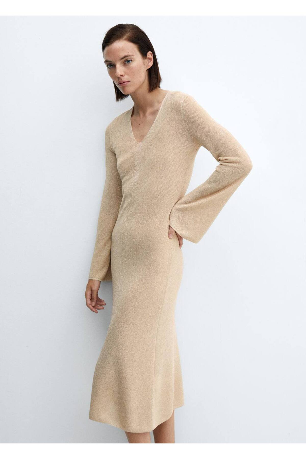 Elbise .– kling-a. Metal iplikli kumaş, Midi boy, Düz tasarım, V yakalı, Uzun çan kol, Kapamasız, Astarlı, Total look. 82% polyester,18% bakir kapli polyester, Astar: 100% polyester. Yan dikiş uzunluğu 91.0 cm, Arka uzunluk 115.5 cm. ELDE MAKS. 30°C’DE YIKAYIN, ÇAMAŞIR SUYU KULLANMAYIN, MAKS. 110°C İLE ÜTÜLEYİN, KURU TEMİZLEME YAPILMAZ, KURUTMA MAKİNESİNDE KURUTULAMAZ
