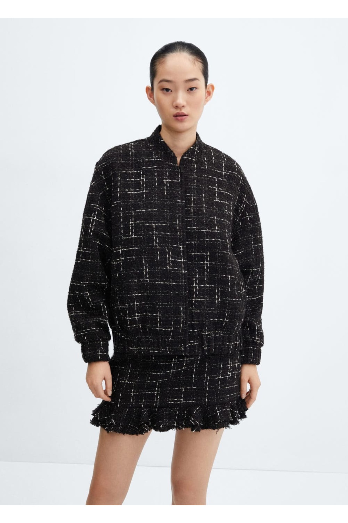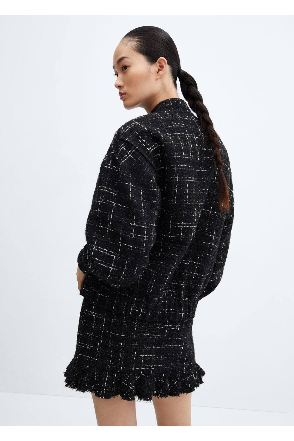 دامن .– دوپله. پارچه ترکیبی پنبه/پشم، پارچه توید، مدل راست، طول کوتاه، کمر کم، بسته شدن زیپ کناری مخفی، جزئیات رفل، آستر، ظاهر کامل. 32% اکریلیک، 21% پلی استر، 17% پنبه، 14% پلی آمید، 13% پشم، 3% ویسکوز، آستر: 96% پلی استر، 4% الاستین. طول درز پهلو 39.0 سانتی متر طول دامن 39.5 سانتی متر. غیر قابل شستشو، از سفید کننده استفاده نکنید، حداکثر. اتو در دمای 110 درجه سانتیگراد، خشک شویی با پرکلرو اتیلن، قابل خشک کردن در خشک کن نیست.