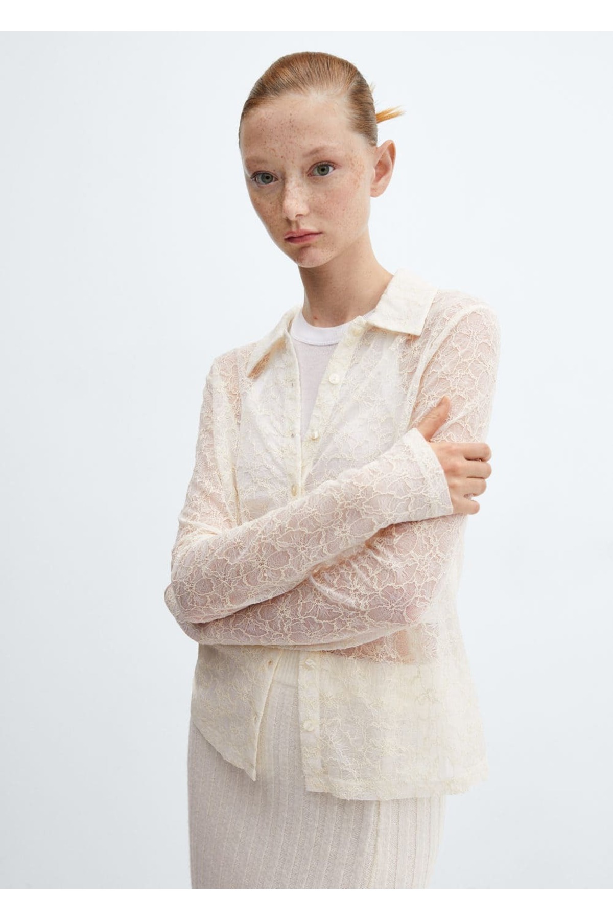 Tişört .– adage. Pamuk karışımlı kumaş, Dantel kumaş, Transparan tasarım, Düz model, Gömlek yakalı, Ön düğmeli kapama. 57% polyamid,25% pamuk,18% elastan. Yan dikiş uzunluğu 33.7 cm, Arka uzunluk 55.0 cm. KISA SANTRFÜJLE MAKİNEDE MAKS. 30°C’DE YIKAYIN, ÇAMAŞIR SUYU KULLANMAYIN, MAKS. 110°C İLE ÜTÜLEYİN, KURU TEMİZLEME YAPILMAZ, KURUTMA MAKİNESİNDE KURUTULABİLİR